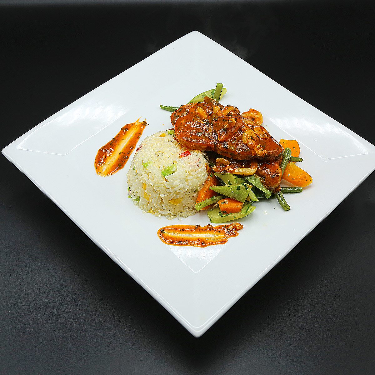 servi avec les légumes et riz ou frites