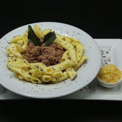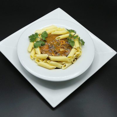 Penne, pomme de terre, dinde fumée, fromage